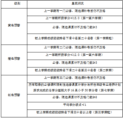第三条 学业预警分为黄色预警,橙色预警,红色预警三个等级,学业预警工作按学期进行,每学期开学后四周内由学院根据学生学业情况建立相应的预警档案并发出预警通知书。