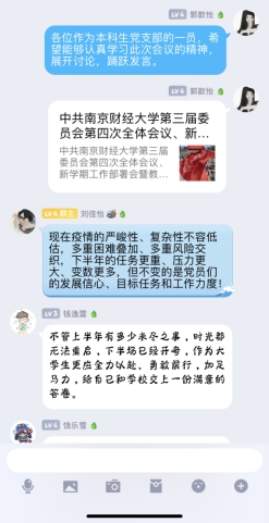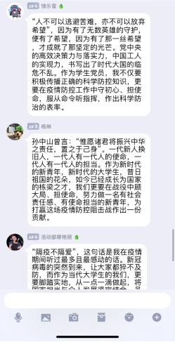 9月18日本科生党支部开展了线上讨论活动,同学们针对此次会议精神进行了踊跃发言。刘佳怡同学说道:“现在疫情的严峻性、复杂性不容低估,多重困难叠加、多重风险交织,下半年的任务更重、压力更大、变数更多,但不变的是党员们的发展信心、目标任务和工作力度。”刘梦娇同学们则说到:“在举国上下万众一心、众志成城做好新冠肺炎疫情防控工作的特殊时刻,大学生作为疫情防控的执行者、先行者,一切行动应当服从政府规章制度、遵从学校指挥,坚持在大战中坚定信心、不负韶华。”同学们争相发言,气氛热烈,最后,由本科生党支部书记冯颖老师总结发言道:“党中央的高效决策力与落实力,中国工人的实现力,书写出了时代大国的临危不乱。作为本科生党支部的成员,你们不仅要积极传播正确的科学防控知识,更要在疫情防控工作中守初心、担使命,服从命令听指挥,要自觉地增强‘四个意识’、坚定‘四个自信’,做到‘两个维护’,要充分发扬“党旗在抗疫一线高高飘扬”的攻坚精神。
