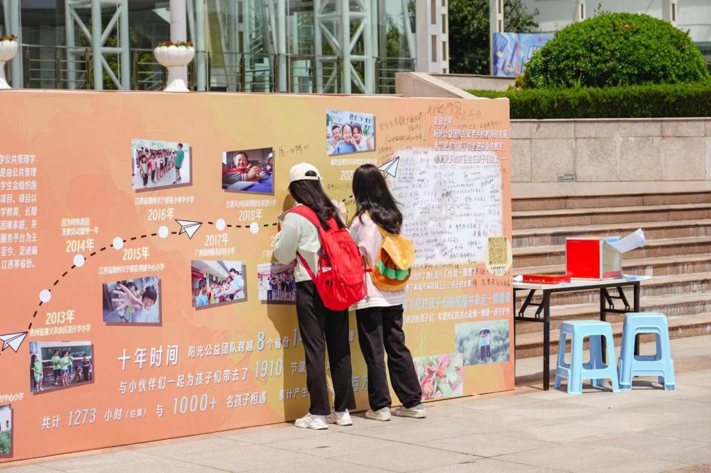 阳光公益团队(小风铃支教队)在我校大学生活动中心前广场搭设了展板平台,以“留下一句祝福,拿走一颗糖”为主题,开启了为期一周的支教展活动,过往同学纷纷驻足观看、签字留名,对孩子们美好的祝愿在春风下留满了展板,收获了热烈的反响。