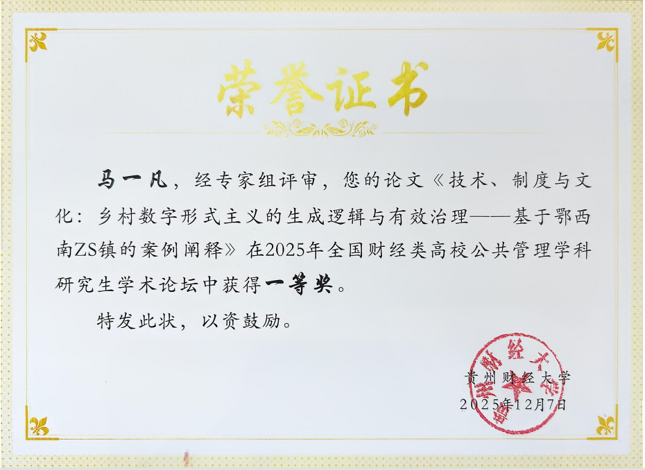 马一凡、任晓晓两位同学的研究成果获得评审专家一致认可,荣获一等奖,为学院赢得了荣誉。论坛一等奖由国务院公共管理学科评议组联合召集人丁煌教授和贵州财经大学党委书记缪坤和教授颁发。