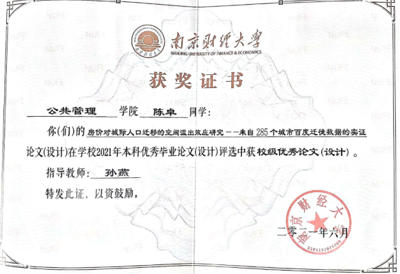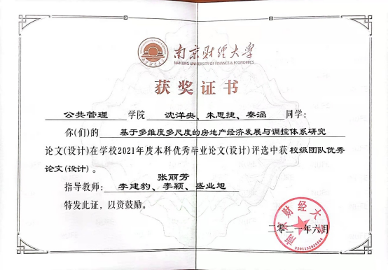 2017级房地产开发与管理专业学生陈卓的毕业论文“房价对城际人口迁移的空间溢出效应研究——来自285个城市百度迁徙数据的实证”(指导老师:孙燕)在52书库 2021年度本科优秀毕业论文评选中获得校级优秀论文;沈洋央、朱思捷、秦涵等同学的论文“基于多维度多尺度的房地产经济发展与调控体系研究”(指导老师:张丽芳、李建豹、李颖、盛业旭)获校级团队优秀论文。