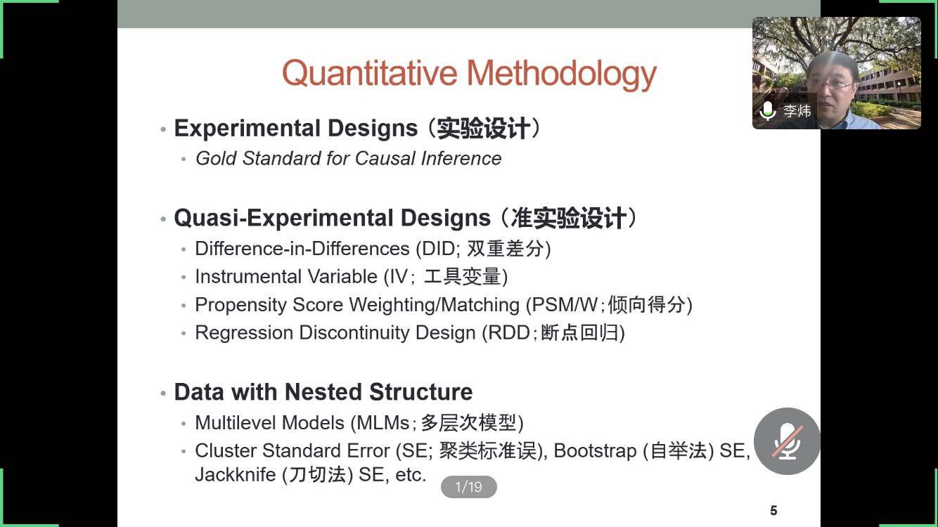首先,李炜教授介绍了自己的学习经历、专业背景及研究方向。接着,他以2019年诺奖RCT为切入点,利用中、美、欧洲多国数据系统探讨了教育经济学领域的经典议题:班级规模与学生成绩的关系。最后,李教授通过个人学术成果分享为老师们提供了宝贵的研究经验,并从研究方法和数据使用层面展开了专业、高效的交流和分享。