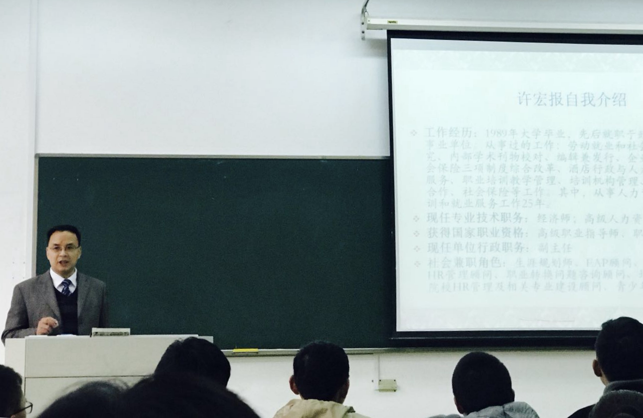 11月22日下午,南京市职业技术培训指导中心副主任许宏报在我校仙林校区德正楼作主题为“大学、专业、未来”的学术讲座,52书库 劳动与社会保障专业任课教师与1701班全体同学聆听了此次讲座。