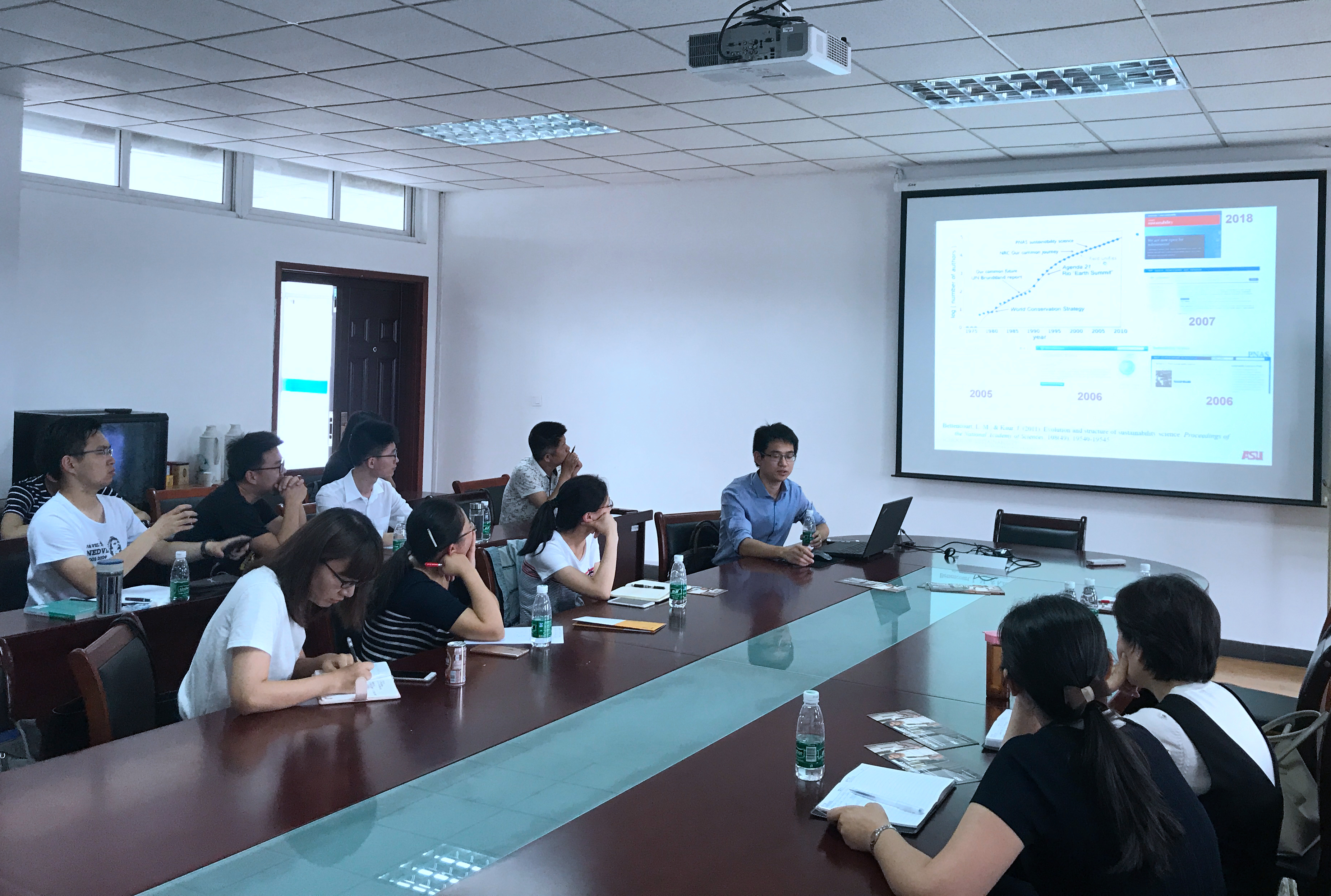 周博士首先强调了为什么要了解和研究可持续性科学,并特别介绍了可持续性科学是什么。可持续性科学是在上世纪可持续发展运动基础上发展起来的新兴学科,主要研究不同尺度人地系统的经济、社会和环境可持续性,其根本宗旨是维持和促进人类福祉。发展可持续性科学具有现势的现实需要和广阔的研究前景。接着,周博士介绍了可持续性科学的发展演化,列举了其发展史上重大事件,并介绍了可持续性科学与可持续发展的区别在于有没有直接考虑人类福祉。周博士还为大家介绍了可持续性科学的领军人物、核心研究问题和前沿研究方向,为大家解读了可持续性科学的经典文献;还介绍了可持续科学的方法论和研究不同对象系统的具体方法。最后,周博士与在座师生就可持续性科学的学术问题以及出国访学等事宜进行了深入的交流,逐一回答了相关问题。
