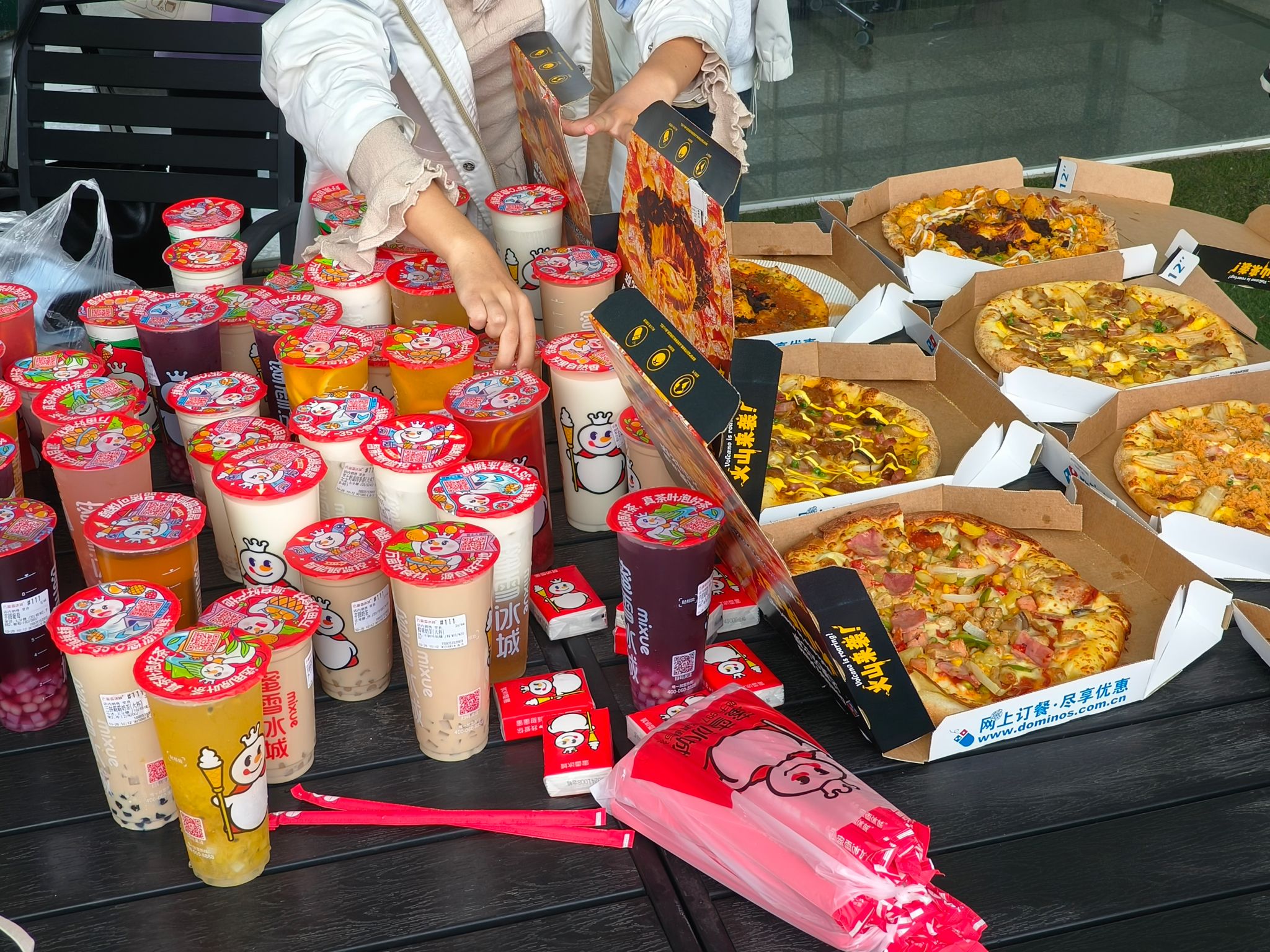 活动开始前,一杯杯奶茶、美味的披萨和零食映入眼帘,这是学生会为每一位成员准备的美食。大家依次领取了奶茶并且一起共享了美味的披萨,从大家在共享美食的笑容中可以看出大家对这次“破冰”活动的期待与兴奋。