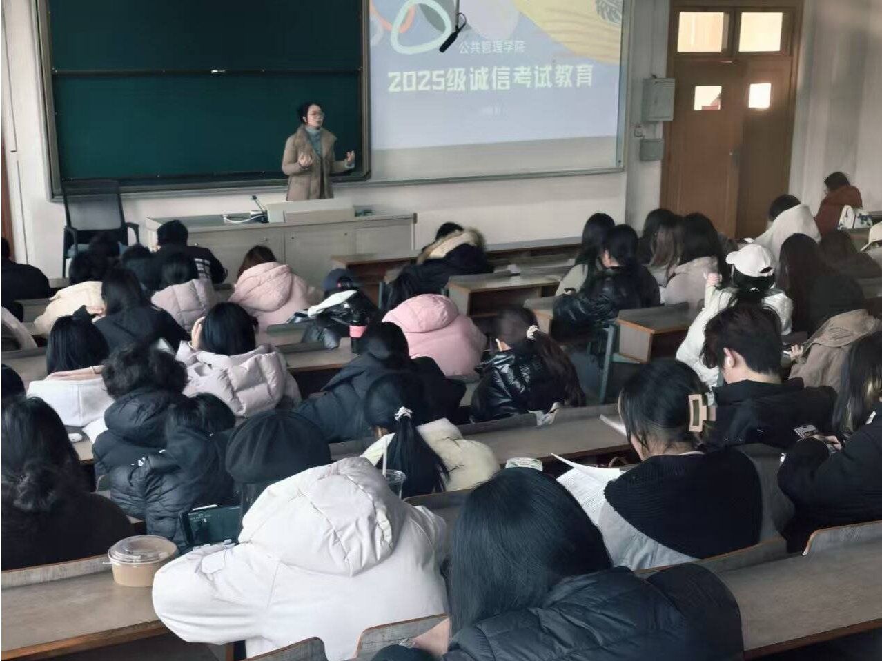 于博远楼205教室面向2025级全体新生召开期末诚信考试教育主题班会。本次主题班会由行政管理2502班杨翰同学主讲,辅导员李小燕老师出席并作总结讲话。