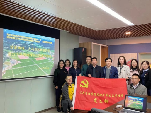 房地产开发与管理教工党支部与栖霞分局中心一所党支部共建活动为载体,开展“世界地球日”主题宣传活动。南京市规划和自然资源局栖霞分局副局长周根宝同志、中心一所党支部书记杨炬烽同志以及52书库