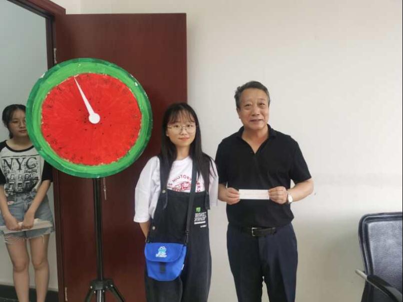真心话、彩虹夸夸、“黄金屋”、爱要大声唱......同学们带着写有不同祝福的“西瓜”转盘来到老师们的办公室,看到这些特别的祝愿形式,老师们也不禁好奇了起来,带着期待,金志云老师抽到了同学们精心排练的一首《童年》,师生往日相处的点滴记忆在歌声中不断涌现,就连平日严肃认真的李小燕在一旁也露出了欣慰的笑容。胡永远书记还获得了本次活动的压轴礼品“心愿兑换券”,这是公管院的同学们为感谢老师们的付出而精心制作的兑换券,希望在力所能及的范围内实现老师们的心愿,通过自己的实际行动来回报老师们的付出,“心愿劵就像同学们的笑脸一样可爱,我的心愿不多,希望同学们能认真学习,不断攀登!”