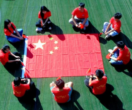 活动的最后同学们自发举行了“我与国旗同框祝福祖国母亲”活动,同学们手持国旗,或围坐在国旗周边高举五星红旗呐喊高歌,或仅是静坐成圈,默默地看着鲜艳的红色,心中的热血与赤诚像是要突破这秋日下的静默,直直注射进这一抹鲜红之中。